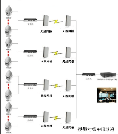 按照要求在前端10台网络高清摄像机分别各用一台HT400无线网桥作为发射。监控中心用3台HT2401无线网桥来接收。接收端收到信号通过交换机把信号集中后再用数字矩阵或者硬盘录像机(NVR)存储显示。