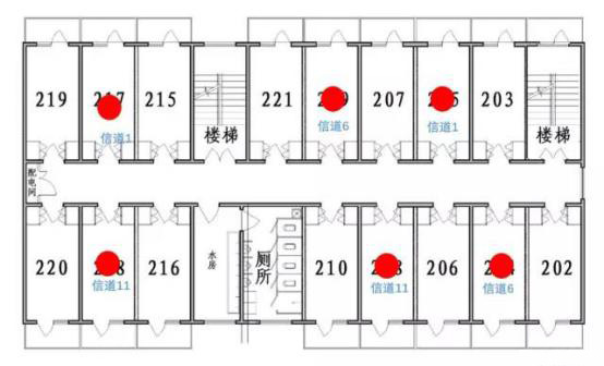 建议把AP安装在宿舍内,覆盖本宿舍和相邻宿舍。如图所示,平均分布安装位置。2.4GHz频道建议要合理规划信道,
